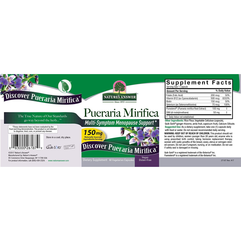 - Nature’s Answer Pueraria Mirifica is optimized with QUIK-SORB. QUIK-SORB is an exclusive blend of important herbs known to enhance delivery of nutrients to the body. So you can be sure that everything, from Nature’s Pueraria Mirifica plant to the active phytoestrogens, Biotin, Selenium, and all the other ingredients are working as hard as they can to give your body what it needs. All with the convenience of a single vegetarian capsule just one time a day.