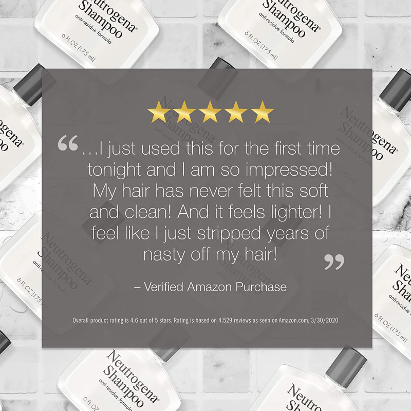 - 6-fluid ounce bottle of Neutrogena Anti-Residue Clarifying Shampoo to help remove up to 90% of heavy, dulling residue caused by shampoos, conditioners & styling products