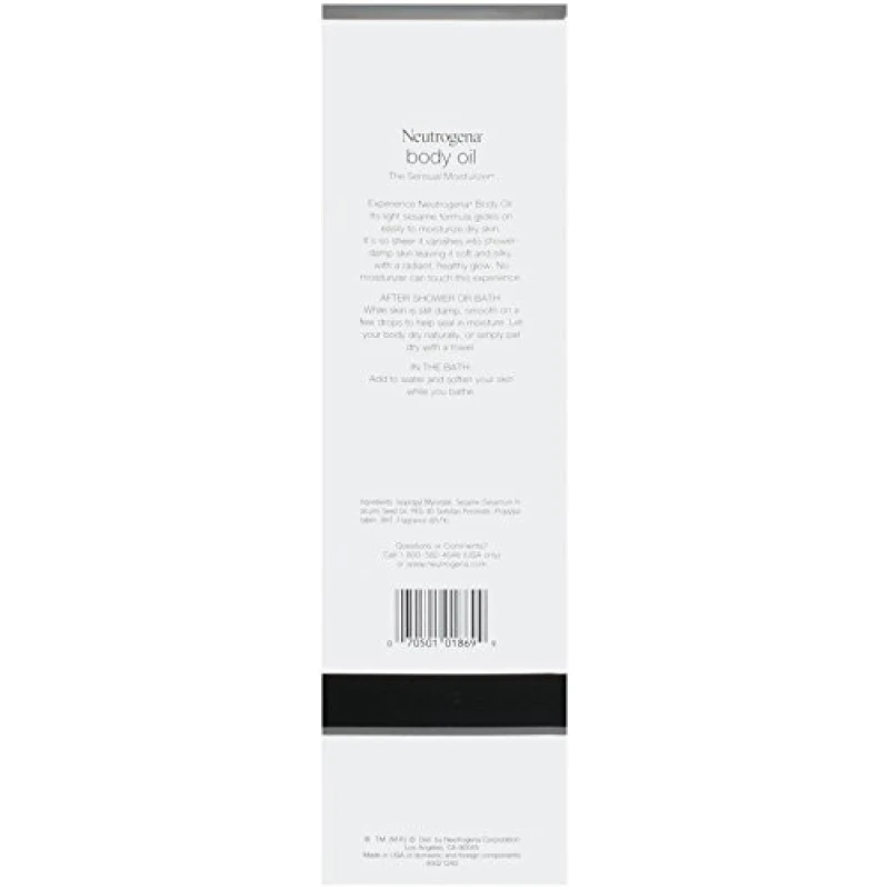 Pamper your skin with Neutrogena Body Oil, a sheer moisturizing experience. This lightweight body oil is made with a delicate sesame formula that vanishes into the skin providing essential hydration for dry skin. While your skin is still damp after a shower or bath, smooth on a few drops of body oil. In the bath, add to water to soften your skin while you bathe. This moisturizing body oil absorbs quickly and leaves skin feeling soft and silky.