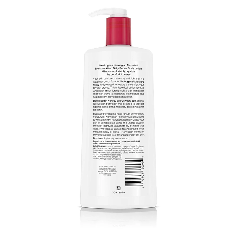 Help relieve dry skin with Neutrogena Norwegian Formula Moisture Wrap Daily Repair Body Lotion. This lotion has been clinically proven to help dry skin hold significantly more moisture at the end of the day. It wraps your skin with a unique combination of moisturizers that penetrate deep into skin for lasting comfort and healing of even the driest skin.Product Feature