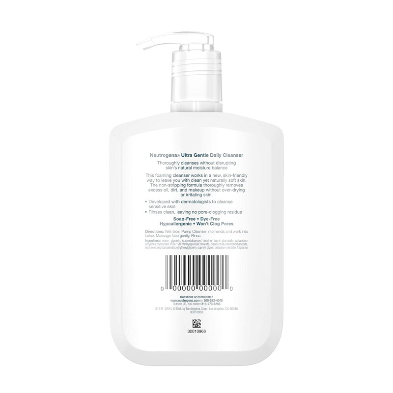 - Neutrogena Ultra Gentle Daily Facial Cleanser for Sensitive Skin, Oil-Free, Soap-Free, Hypoallergenic & Non-Comedogenic Foaming Face Wash, 12 fl. oz