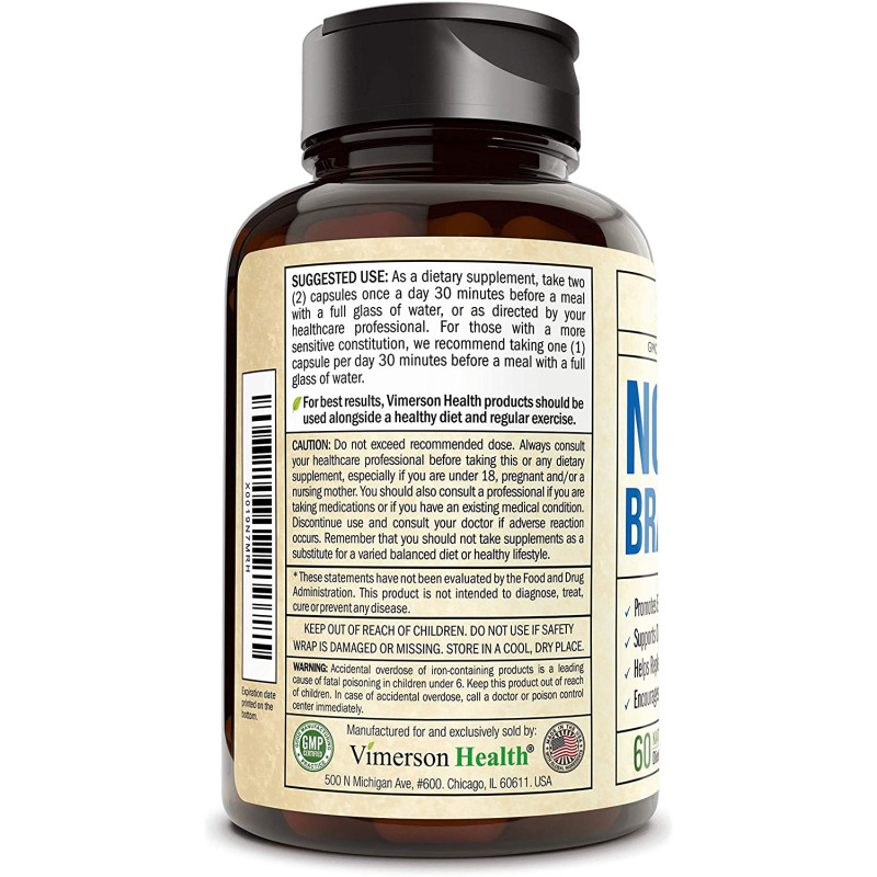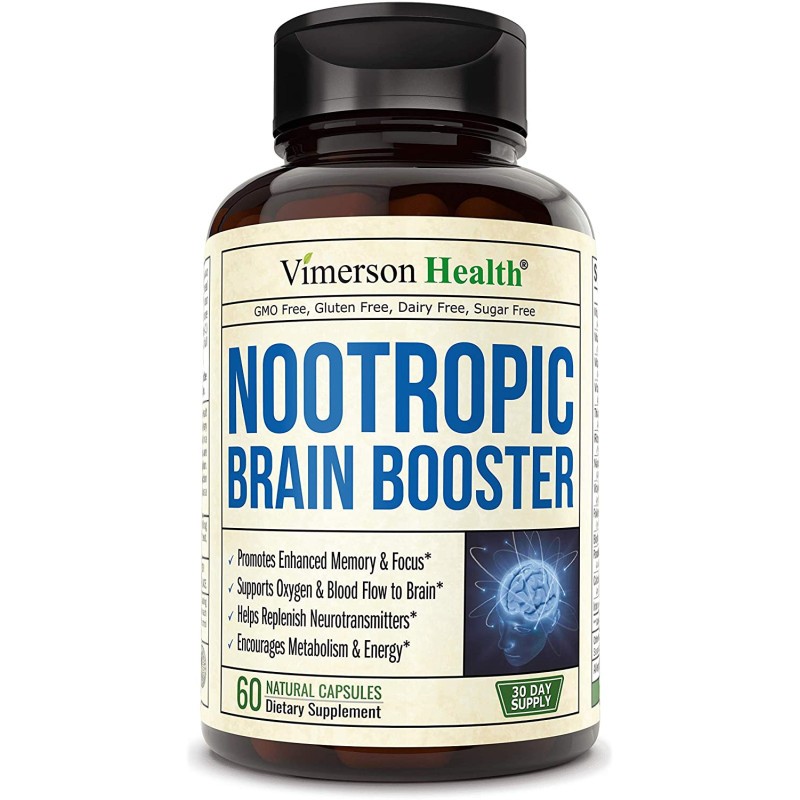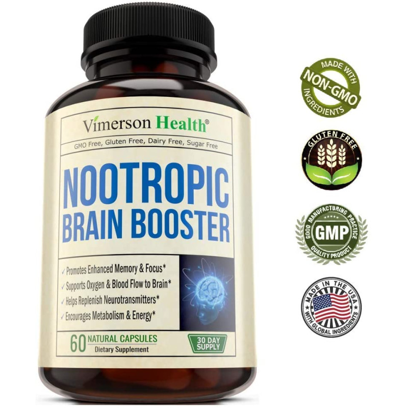 Nootropic Brain Booster by Vimerson Health may help heighten mental performance by sharpening your focus and intensifying your concentration.* Our supplement supports good blood circulation and oxygen flow to the brain, allowing for a more efficient transmission of essential nutrients.* Nootropic Brain Booster promotes memory retention, may help replenish neurotransmitters, and aids in boosting serotonin levels for a happier mood.*