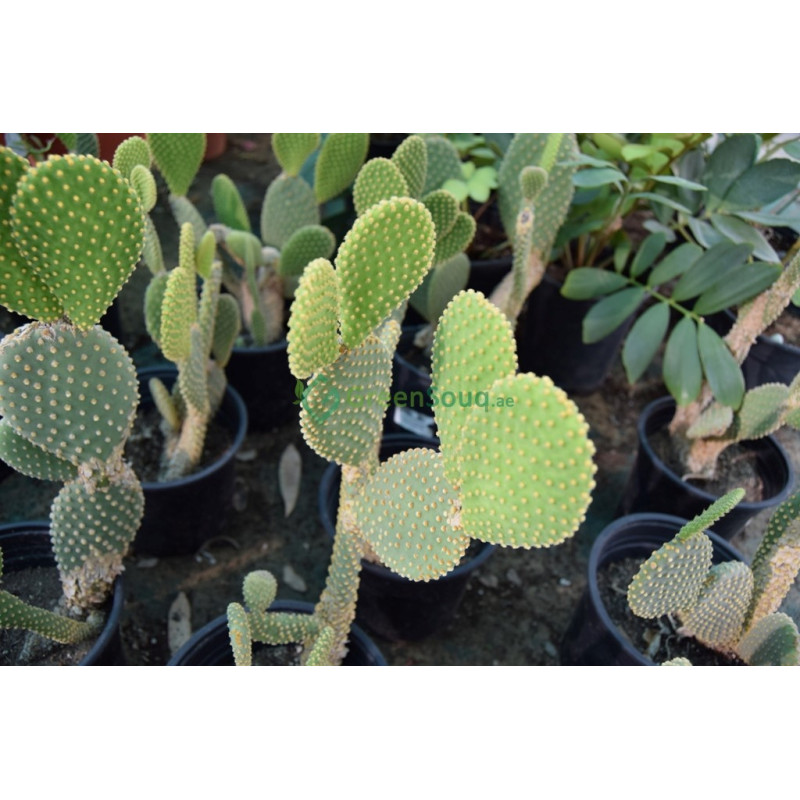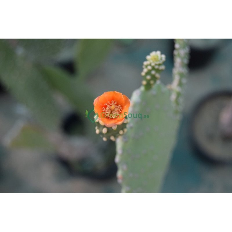 Opuntia ficus indica is Know as Smooth Mountain Prickly Pear, Indian Fig, Mission Cactus, Tuberous Prickly Pear and Nopal. Bushy or tree-like, perennial cactus with stems composed of flattened, obovate to oblong, greyish green or mid-green segments, 10-40cm long, with white areoles producing yellow glochids and usually 1 or 2 spines. Bowl-shaped yellow flowers, 10cm across, are produced in late spring and summer, and are followed by edible, ovoid, spineless purple fruit, to 10cm long. Some cultivars have yellow, orange, or red fruit. perfect to use outdoors.