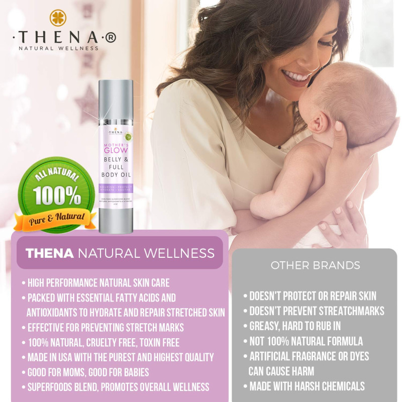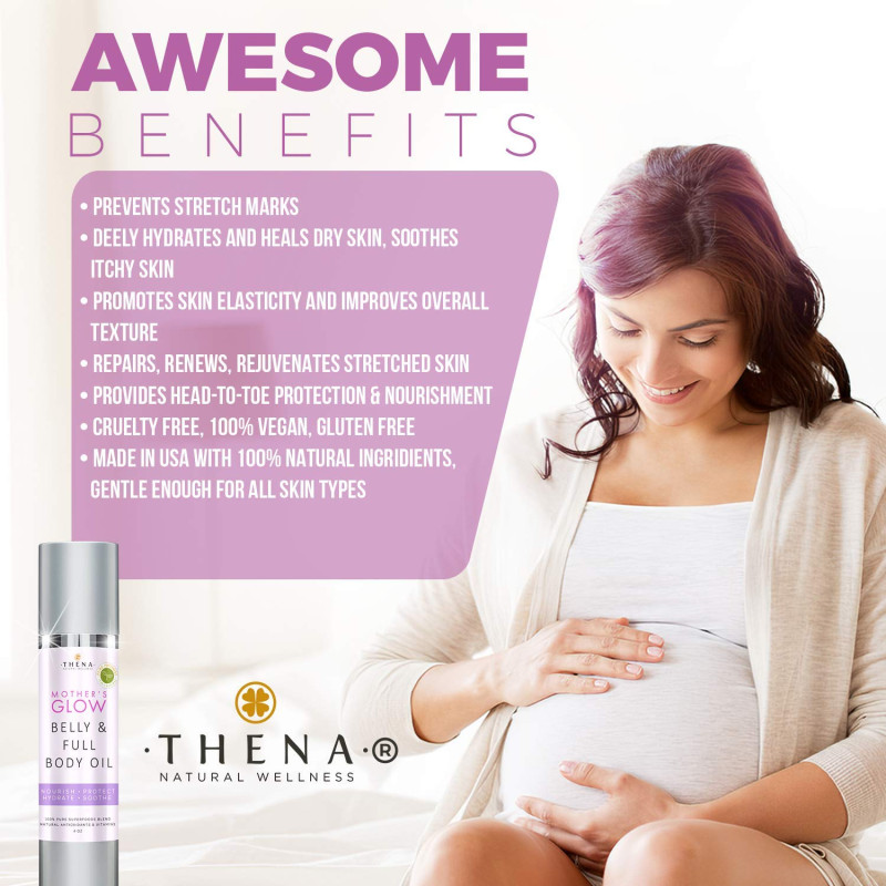 Mother's Glow Belly & Body Oil -Made with 100% natural ingredients -Protects and keeps skin hydrated, moisturized, and soothed -Effectively repairs and prevents the appearance of stretch marks -Absorbs fast and does not leave a greasy feeling -Made by leaders in the industry
