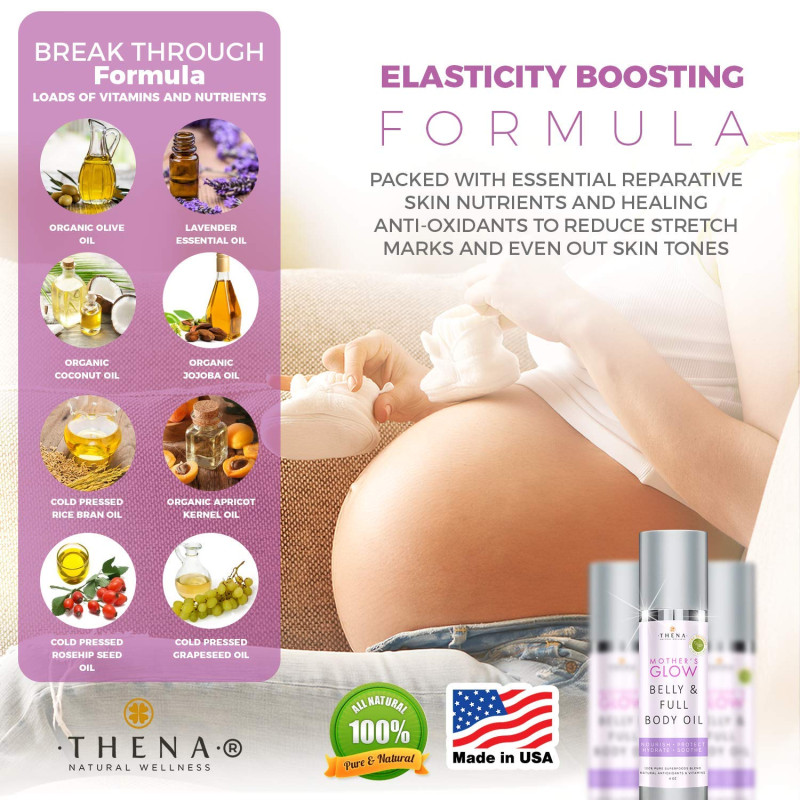 - Elasticity-boost blend enriched with antioxidant vitamin E, the pregnant belly oil contains natural plant collagen that helps improve the appearance of stretchmarks with daily regular use, restores resilience, evens tone, moisturizes and repairs skin