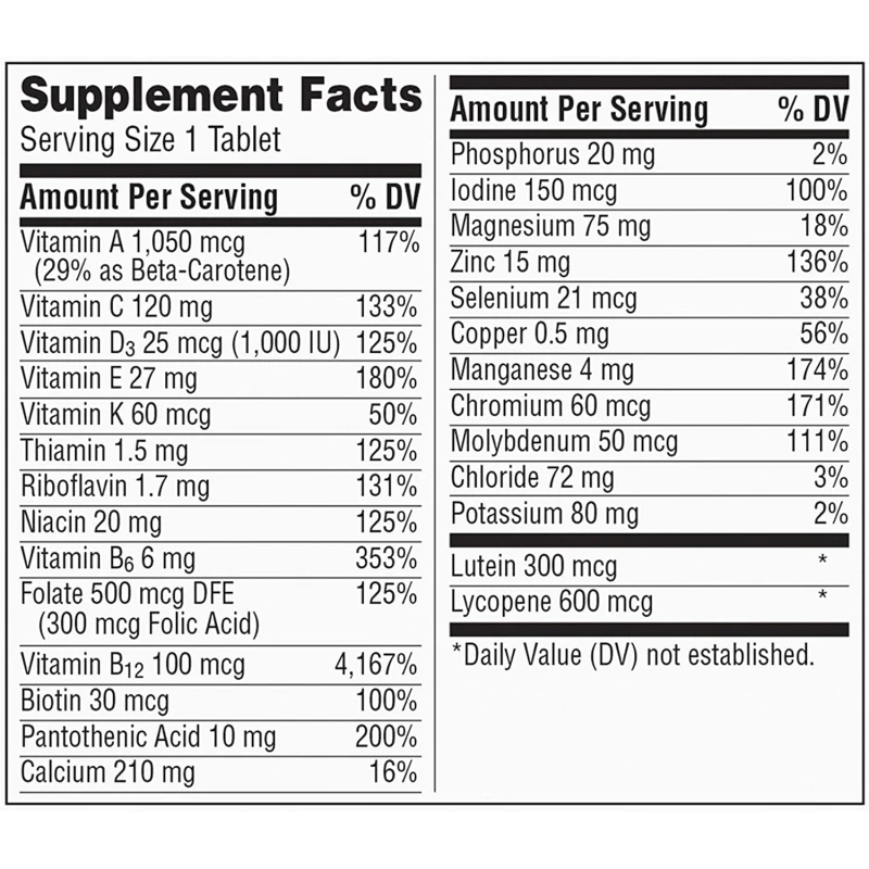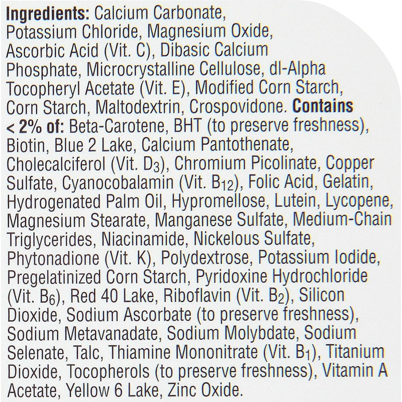 Calcium Carbonate, Potassium Chloride, Magnesium Oxide, Ascorbic Acid (Vit. C), Microcrystalline Cellulose, Dibasic Calcium Phosphate, Dl-Alpha Tocopheryl Acetate (Vit. E), Modified Corn Starch, Corn Starch, Crospovidone. Contains < 2% Of: Beta-Carotene, Bht (To Preserve Freshness), Biotin, Blue 2 Lake, Calcium Pantothenate, Cholecalciferol (Vit. D3), Chromium Picolinate, Copper Sulfate, Cyanocobalamin (Vit. B12), Folic Acid, Gelatin, Hydrogenated Palm Oil, Hypromellose, Lecithin (Soy), Lutein, Lycopene, Magnesium Stearate, Maltodextrin, Manganese Sulfate, Medium-Chain Triglycerides. Niacinamide, Nickelous Sulfate, Phytonadione (Vit. K), Polydextrose, Polyethylene Glycol, Polyvinyl Alcohol, Potassium Iodide, Pregelatinized Corn Starch, Pyridoxine Hydrochloride (Vit. B6), Red 40 Lake, Riboflavin (Vit. B2), Silicon Dioxide, Sodium Ascorbate (To Preserve Freshness), Sodium Metavanadate, Sodium Molybdate, Sodium Selenate, Talc, Thiamine Mononitrate (Vit. B1), Titanium Dioxide, Tocopherols (To Preserve Freshness), Vitamin A Acetate, Yellow 6 Lake, Zinc Oxide.