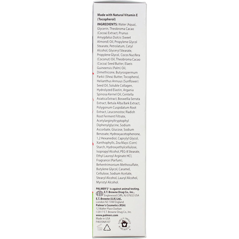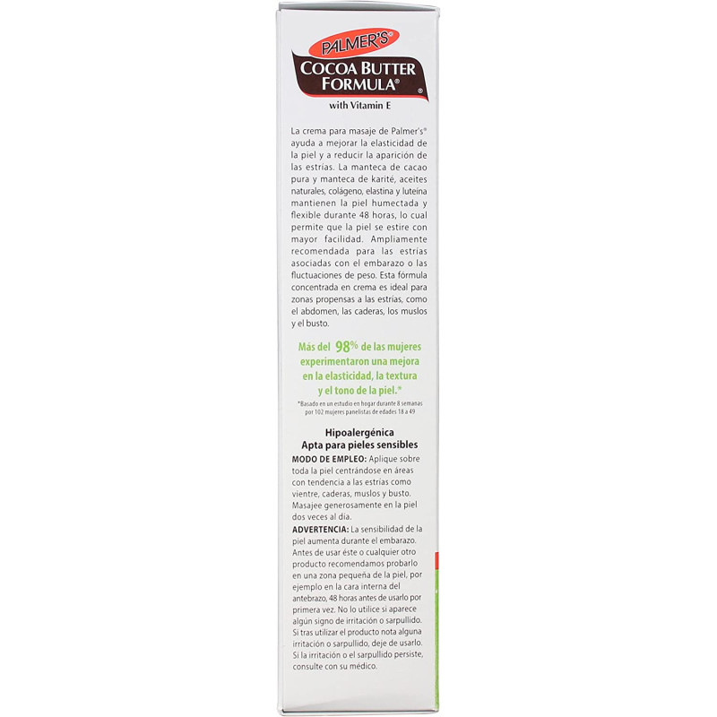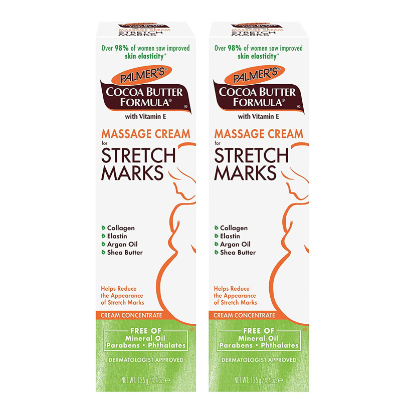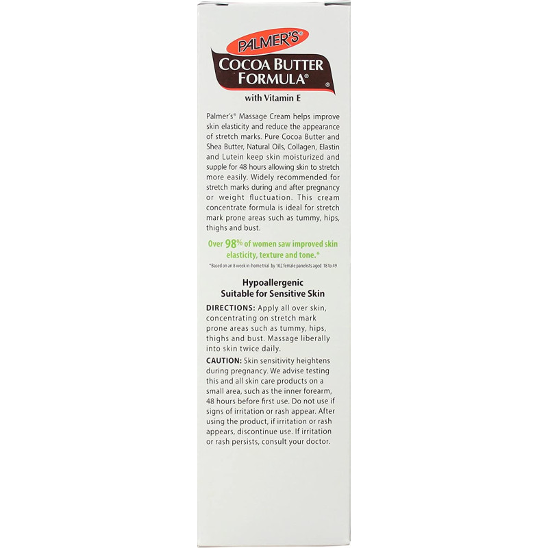 Palmer's Cocoa Butter Formula Massage Cream helps visibly improve skin elasticity and reduce the appearance of stretch marks. Pure Cocoa Butter and Shea Butter, Natural Oils, Collagen, Elastin and Lutein keep skin moisturized and supple for 48 hours allowing skin to stretch more easily. Widely recommended for stretch marks during and after pregnancy or weight fluctuation. This cream concentrate formula is ideal for stretch mark prone areas such as tummy, hips, thighs and bust. Over 98% of women saw improved skin elasticity, texture and tone.* Hypoallergenic • Mineral Oil Free • Paraben Free • Phthalate Free • Dermatologist Approved *Based on an 8 week in-home trial by 102 female panelists aged 18 to 49 Product directions: Apply all over skin, concentrating on stretch mark prone areas such as tummy, hips, thighs and bust. Massage liberally into skin twice daily. Safety warnings: Skin sensitivity heightens during pregnancy. We advise testing this and all skin care products on a small area, such as the inner forearm, 48 hours before first use. Do not use if signs of irritation or rash appear. After using the product, if irritation or rash appears, discontinue use. If irritation or rash persists, consult your doctor. Key Ingredients: Cocoa Butter & Shea Butter: provides all day hydration and softens, smoothes and plumps skin while forming a protective moisture barrier for expanding bellies Vitamin E: a powerful antioxidant Lutein: a natural antioxidant that helps improve skin hydration and supports stretching skin Argan Oil: packed with essential fatty acids, vitamins and minerals while helping to soften and condition skin while helping reduce the appearance of scars Almond Oil: rich in Vitamin E, omega-3 fatty acids and antioxidants, this essential oil extracted from sweet almonds moisturizes dry skin Coconut Oil: this naturally moisturizing oil, extracted from raw coconut, is rich in fatty acids and helps support healthy, supple skin
