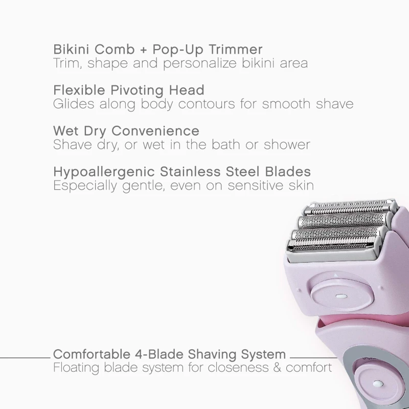 This women's electric leg shaver, underarm shaver and bikini shaver is designed with four, ultra-sharp blades and dual, ultra-thin foils for optimum closeness and comfort. Together with a quick-pivot shaving head, this women's razors electric glides effortlessly along the body's natural curves and contours to easily reach and smoothly shave legs, arms, under the arms and bikini areas.