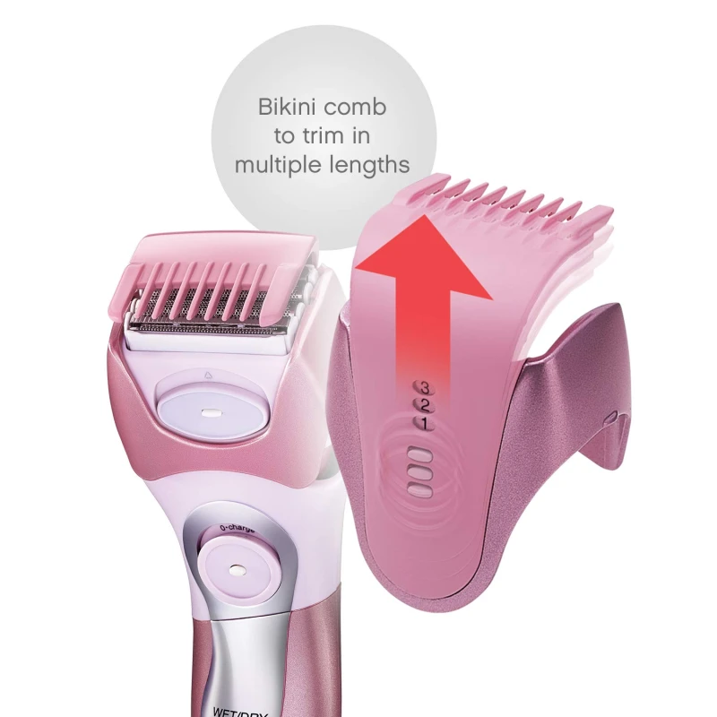 Fully immersible, the quiet, cordless Panasonic ES2216PC ladies electric razor shaves and trims smoothly on dry skin — ideal for a quick trim or touch up when time is short. And when time permits, this exceptional female shaver is the perfect grooming tool to use in the bath or shower with foam or gel for the ultimate in personal shaving and trimming convenience.
