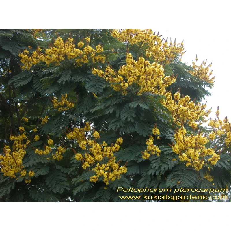 Peltophorum pterocarpum is Fast-growing tree, wide-spreading and freely branching, with rust-red-downy stems. In summer, produces ascending racemes, to 45cm long, of fragrant, bright yellow flowers, 4cm across, with obovate, crinkly petals, each with a central brownish red mark. Elliptic to oblong, winged, purple-brown seed pods are 8-10cm long.