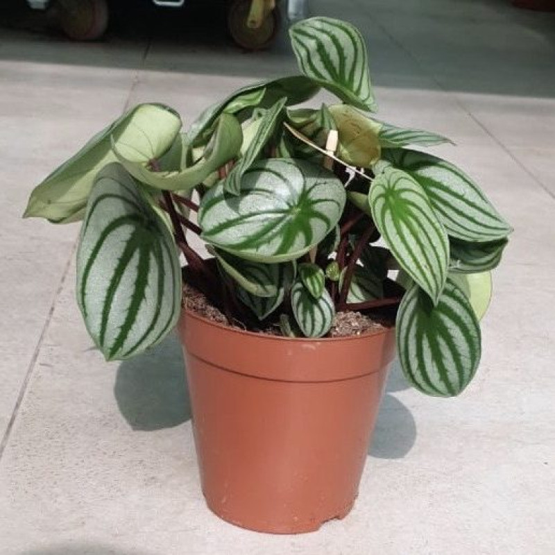 Peperomia argyreia or Watermelon Peperomia is an evergreen flowering perennial plant. Native to Florida, Mexico and the Caribbean. For the size of this plant as a whole the leaves are fairly large. These peltate leaves (stem attached centrally) are kind of oval in shape and display an outstanding mixture of green and silver stripes. The leaves have a fleshy feel to them that are attached to thin non-woody red stems. Most of the Peperomias are easy enough to grow indoors in containers. Humidity and light are important. Windowsills and conservatories are ideal places to display this plant. Light is an important while finding a spot indoors to grow a Water melon Peperomia.
