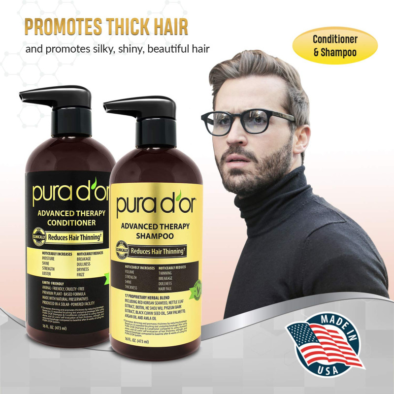 PURA D’OR Advanced Therapy Shampoo and Conditioner Set is a best-selling hair thickening formulation with natural ingredients. The powerful blend of 17 Key Active Ingredients helps improve the volume and thickness of hair, while reducing any scalp irritations with added Zinc Pyrithione. It provides excellent nourishment leading to healthier, thicker hair.