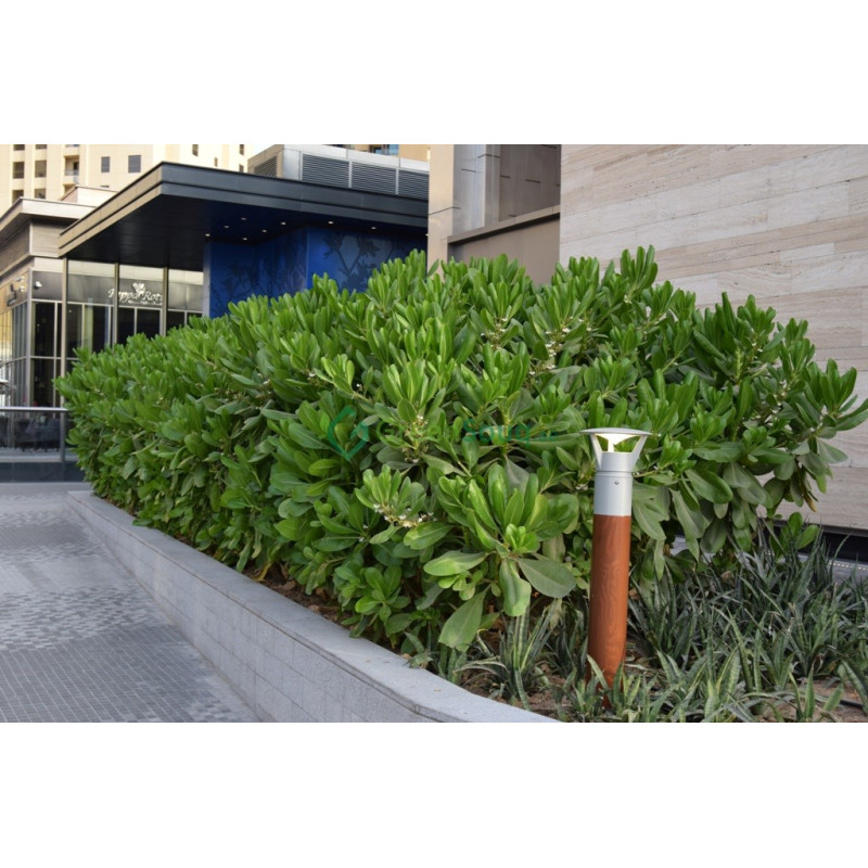 Scaevola frutescens loosely rounded to spreading shrub is a robust grower that is commonly 3 to 10 feet tall with an equal spread. They form a rounded clump where they have been planted along the beaches of south Florida. It has fleshy, bright green leaves that are densely clustered at the tips of the branches. The inconspicuous, axillary flowers of this shrub are borne in clusters of 5 to 9 and occur throughout the year. The individual flowers are white, fragrant, and comprised of only half of a full corolla. The medium-sized fruits of this shrub are white, pithy berries. Idea for coastal areas of UAE.