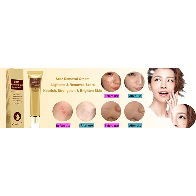 Cherioll Acne Scar Removal Cream Skin Repair Face Cream Acne Spots Treatment Blackhead Whitening Cream Stretch Mark Remover is highly effective in fading away scars from acne, cuts, stretch marks, c-sections, and surgeries. The appearance of old and new scars will lighten for clearer and brighter skin.