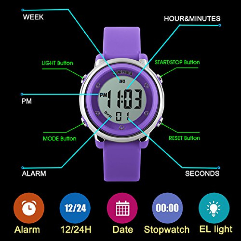 Kid Watch Multi Function 50M Waterproof Sport LED Alarm Stopwatch Digital Child Wristwatch for Boy Girl Purple