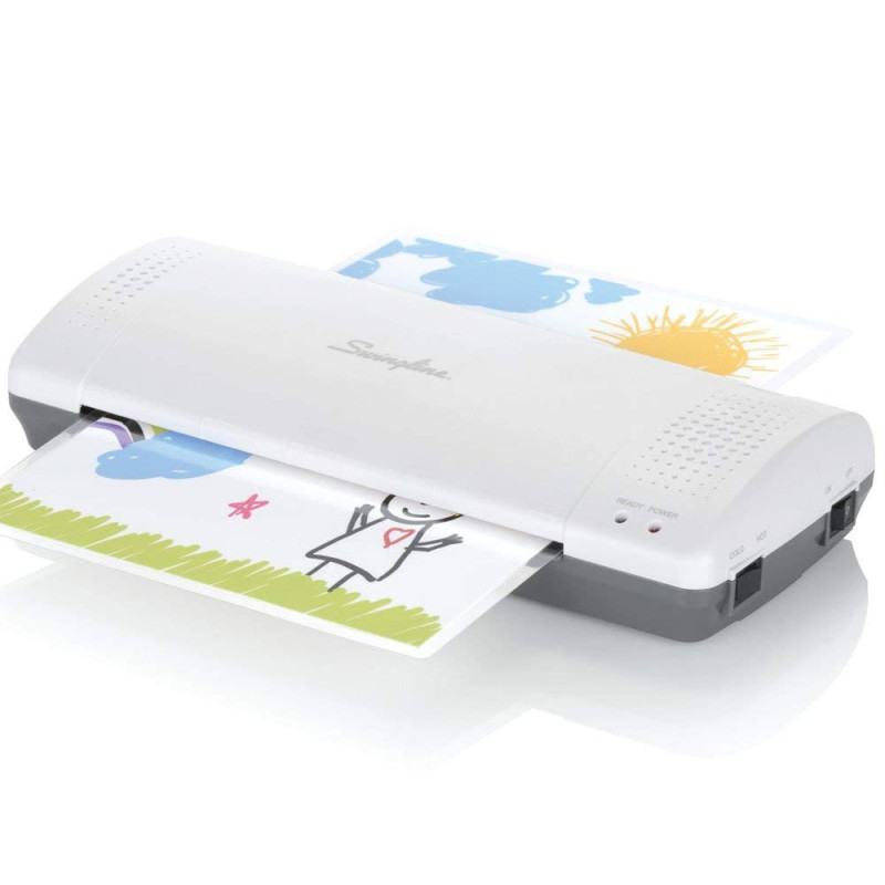 Laminates at 9" per minute; Finished items lie flat to cool with no need for an exit tray; Laminator is white to match most home décor; 120 volts AC, 60 Hz.; 90 day warranty