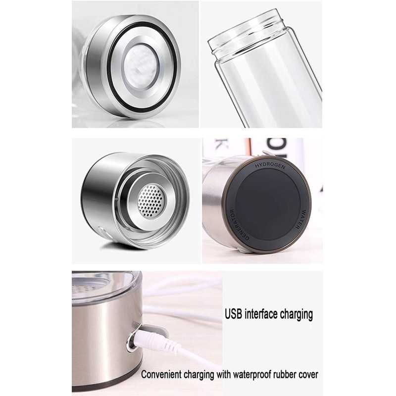 - 【Easy & Safe】:Hydrogen water machine One-button quick operation,USB rechargeable,saving more money than Hydrogen Infused Water pack or h2 water. Made of Food grade borosilicate glass and Food grade rubber, without any harmful chemical subsances.This ionized water bottle can be used about 20 times for one charging,easy and convenient for office,travel,work.