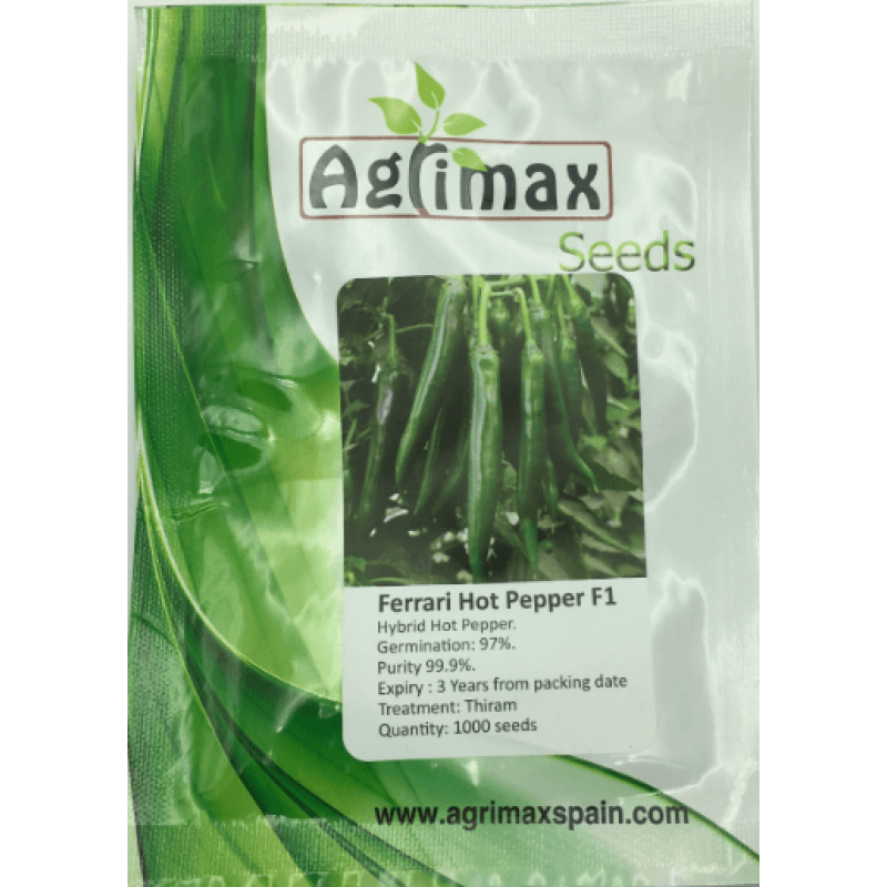 Hot Pepper Ferrari F1 is dark green fruit with bright red color when mature. Highly recommend for high density planting. Growth vigorously, high density fruits, high disease resistance.