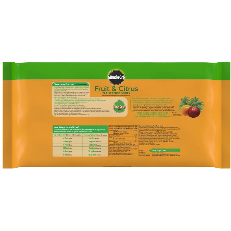Miracle-Gro Fruit & Citrus Fertilizer Spikes extend the beauty of your garden to the rest of your landscape with Miracle-Gro Fruit and Citrus Plant Food Spikes. Use once a season in the Spring and Fall, for lush foliage and palms, and greater fruit production. These easy-to-use spikes provide nutrition directly to the roots, where trees need it the most and include natural ingredients.