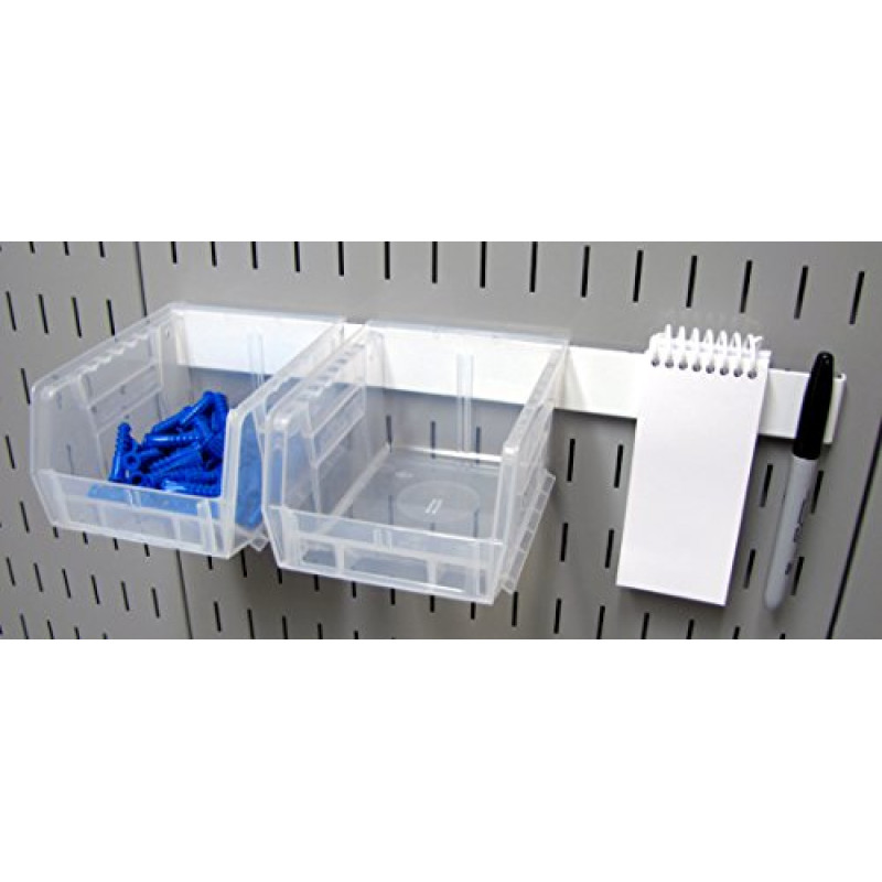 The Wall Control Pegboard 14in Accessory Tool Holder Bracket Metal Pegboard Accessory for Wall Control's Pegboard and Slotted Tool Board is a pegboard accessory for attaching helpful items to your Wall Control pegboards and tool boards such as plastic hanging bins. Almost any tool storage accessory from another manufacturer that features a lip for attachment to a louvered panel, wall, or tool box can be attached to Wall Control metal pegboard and slotted tool board panels with the use of an Accessory Hanger. Wall Control Slotted Metal Pegboard Hooks and Supplies feature a scratch and rust resistant baked-on finish. These more secure and stable tool board accessories are for use with the slots found in all Wall Control Metal Pegboard tool board panels only. Wall Control Slotted Tool board accessories offer a patented engagement that requires two deliberate motions up-and-down to engage and disengage the hooks. This feature makes Wall Control Slotted Pegboard accessories less likely to fall out of the tool board than conventional peg hooks that can easily fall off when tools are removed. Although Wall Control Metal Pegboard Panels will accept conventional 1/4in pegboard accessories as well as Wall Control Slotted Accessories the Slotted Secure Tool Board Accessory included here is only for use with Wall Control Metal Pegboard Panels and Tool Boards. Wall Control Pegboard Products are Made in the USA (1) White Metal Pegboard 14in Accessory Hanger Tool Holder Pegboard Bracket Included Only for use with Wall Control Pegboard and Slotted Tool Board Panels.Product Feature