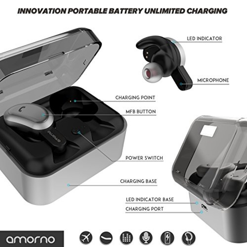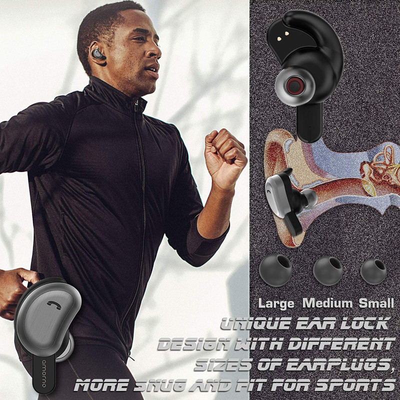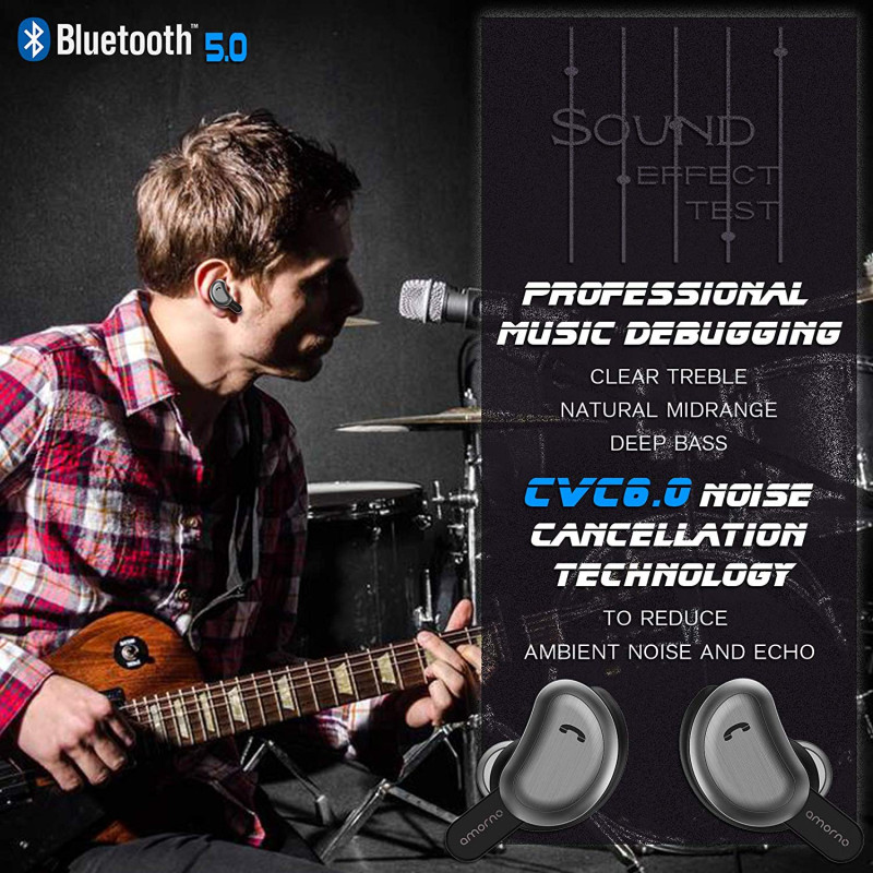 【Noise cancelling & HD Sound Quality】AMORNO wireless headphones adopt DSP noise cancellation technology to reduce ambient noise and echo.Upgrade super balanced Bass and premium vibrating diaphragm technology to ensure incredible truly 3D sound.Enjoy the HI-FI and super bass sound!【 Most Stable Signal& Secure Fit Design】Our True Wireless earbuds use bluetooth V5.0 chipset to provide stable connection and signal transmission. 3 sizes ear tips ( S/M/L) to fit most ears,with unique lock ear design,never falling out.Made of luxury aerometal,comfortable silicon earplug,light weight and sweatproof for running,jogging..